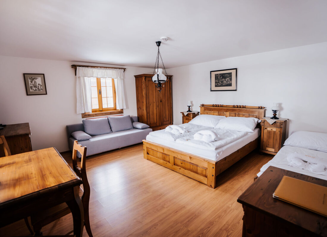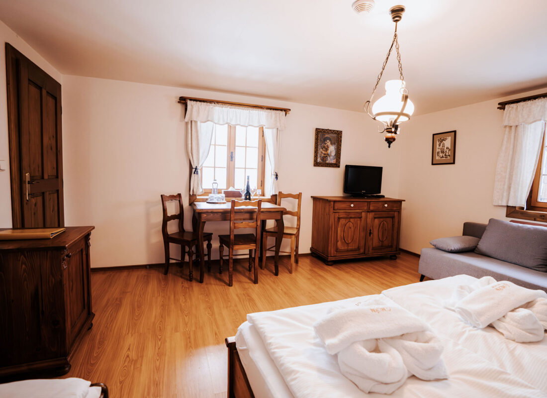 Pokoj má úschovu kol, Wi-Fi připojení, minibar, trezor a vše doplňuje kvalitní ložní prádlo a měkké ručníky. Zastřešená veranda s lavičkou zve k posezení a odpočinku v přírodě.