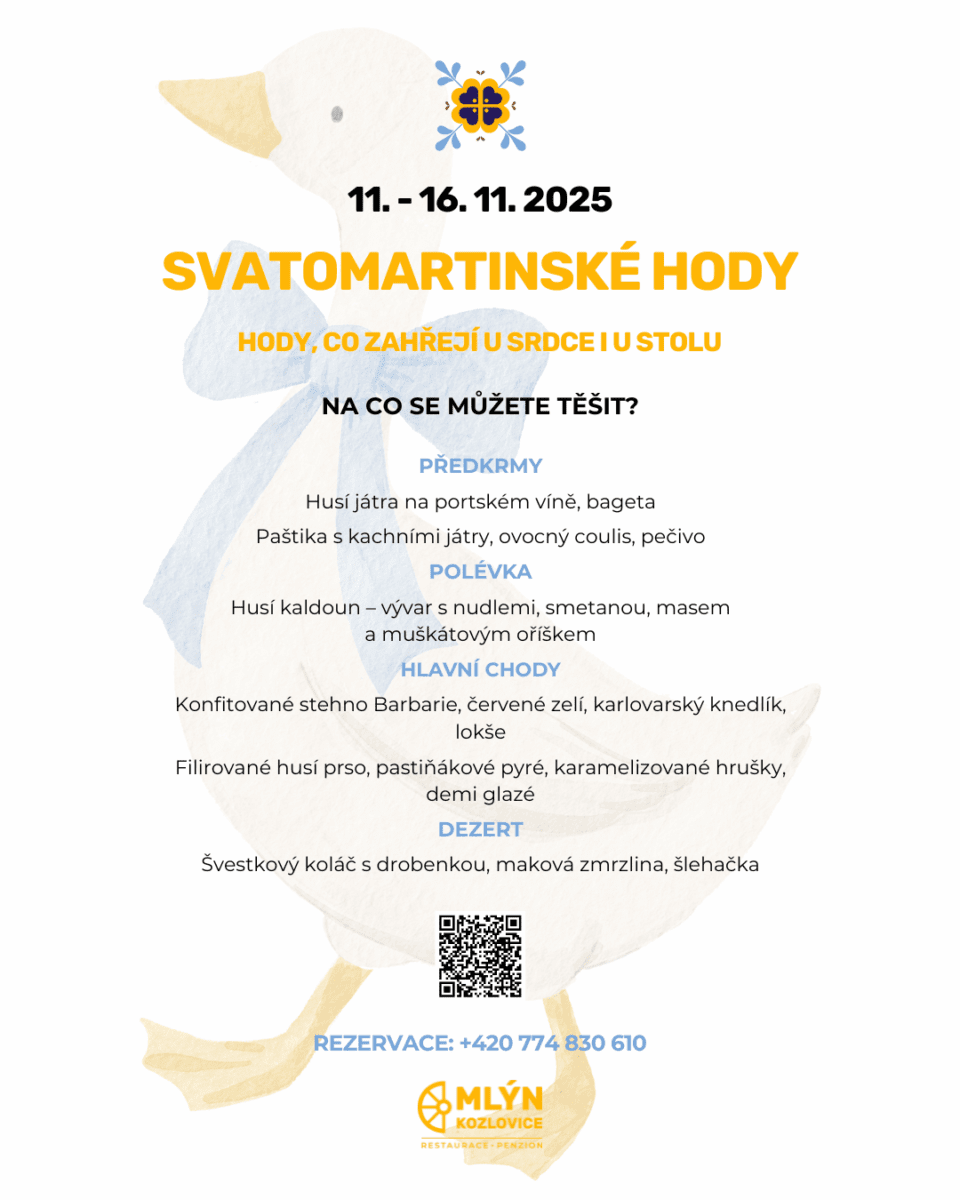 Podzim má ve Mlýně Kozlovice svou nezaměnitelnou atmosféru – vůni pečené husy, praskání ohně a sváteční klid, který k listopadu prostě patří.