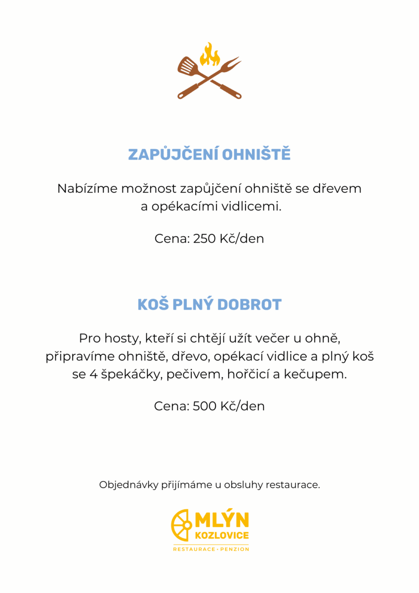 Hosté si mohou půjčit ohniště včetně připraveného dřeva a opékacích vidlic. Tato služba je ideální pro všechny, kteří chtějí prožít večer v příjemném prostředí a s minimem starostí. Pro úplné pohodlí nabízíme také koš plný dobrot. Najdete v něm špekáčky, čerstvé pečivo, hořčici a kečup. Vše, co je potřeba pro bezstarostný večer u ohně, budete mít nachystané.